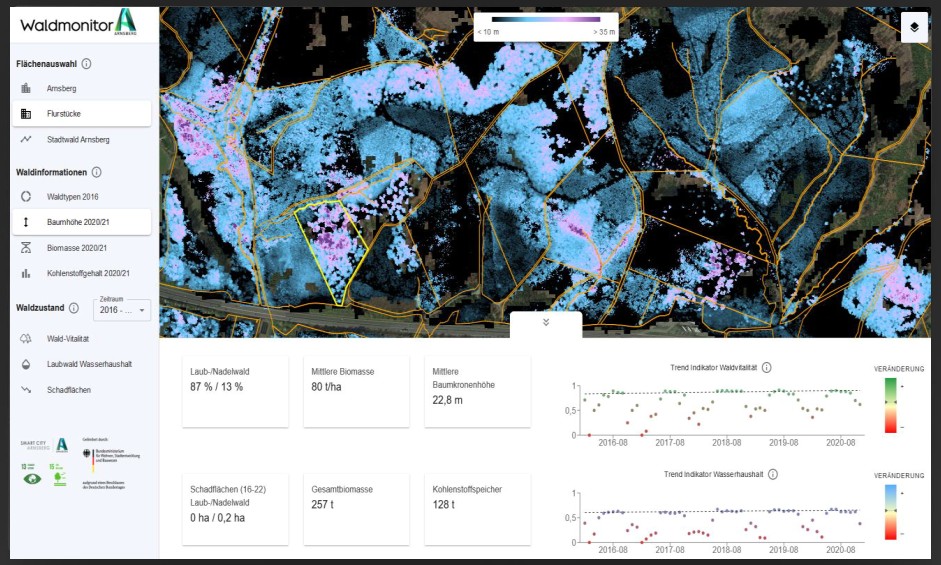 Die auch als Digitaler Waldzwilling bezeichnete Lösung erlaubt es, die Entwicklung des Zustandes von Laub- und Nadelbäumen in Bezug auf ihre Vitalität und ihren Wassergehalt zu überwachen, die Waldbiomasse und den darin gespeicherten Kohlenstoff zu schätzen und die Schadflächen der letzten Jahre zu quantifizieren. Der Waldmonitor Arnsberg ist ein Projekt des Smart City Modellprojekts „5 für Südwestfalen“. Initiiert wurde er von der Stadt Arnsberg, entwickelt von der Firma Remote Sensing Solutions GmbH und wissenschaftlich begleitet von der Naturwald Akademie aus Lübeck.