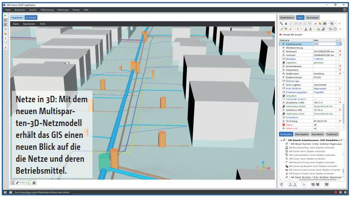 Darüber hinaus gewinnt die 3D-Fähigkeit der Netzdaten zunehmend an Bedeutung, um Kernprozesse wie Planung und Netzausbau im Sinne eines BIM-Ansatzes (Building Information Modeling) zu unterstützen. Ebenso ist der Einsatz neuer Technologien zur erweiterten Realität (Augmented Reality „AR“) möglich. Die Fachschalen stellen für diese Anwendungszwecke bereits ein 3D-Punktmodell bereit, welches auch mit Version 6 erweitert wird. Es ermöglicht die Speicherung der wahren Lage bei verdrängter Darstellung und ist gemeinsam mit dem Digitalen Geländemodell Basis für die integrierte 3D-Netzdarstellung im Smallworld. Auch im Kontext der Entwässerung können Anwender bereits heute von der Umstellung des Geometriemodells der Fachschale Kanal von 2½D auf 3D profitieren.