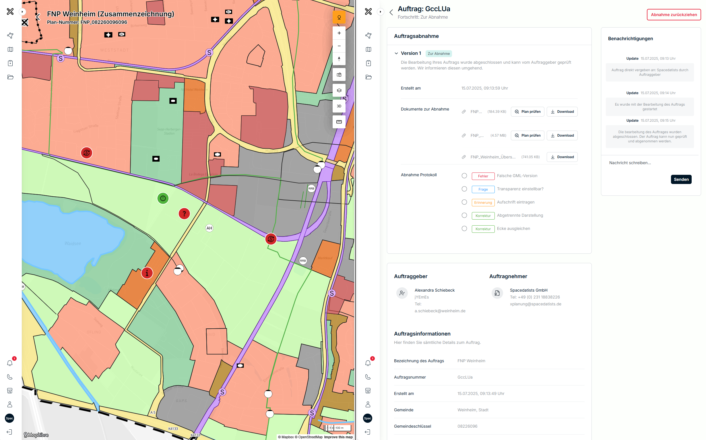 Wagner: Wir sind Nutzer des Portals seit der ersten Stunde. Es hat sich seit der Entwicklungs- und Testphase im Sommer 2024 unglaublich gewandelt. Heute nutzen wir es primär für die Einholung von Angeboten für XPlanung-konforme Digitalisierungsdienstleistungen sowie die Online-Überprüfung und Abnahme der XPlan-Daten. Hierfür erleichtert das Auftragsmanagement die Kommunikation und inhaltliche Prüfung immens. Lange Zeit mussten wir die gelieferten GMLs erst in unser lokal installiertes System importieren. Die Darstellung des Plans war dann meist etwas anders als vom Dienstleister gerendert, weil die Erfassungssysteme