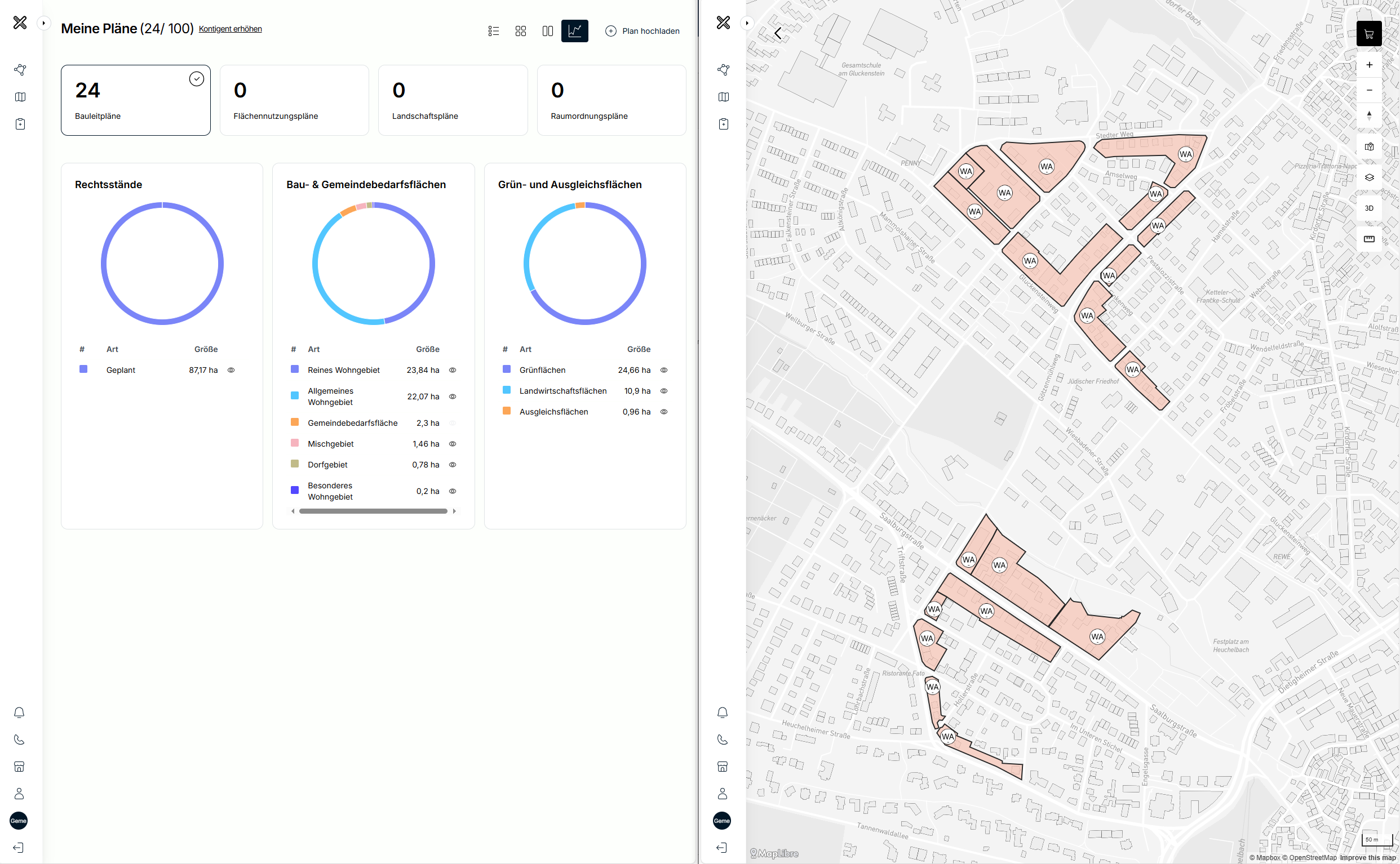 Flächenauswertung und Flächenstatistik mit XPlanung. Das neue Dashboard zeigt Flächenstatistiken über alle GMLs im Account hinweg und aktualisiert sich dynamisch je nach Filter- und Sucheinstellung (links). Per Auswahl einer der Objektklassen und/oder -Ausprägungen werden die Ergebnisse im Webviewer angezeigt, sodass einfache Suchen (z.B. alle Allg. Wohnbauflächen oder alle Ausgleichsflächen in einer Kommune oder in einem Landkreis) räumlich verortet werden können (rechts). Foto: XPlanung24