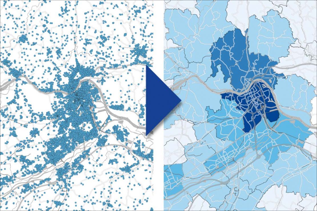 Datenintegration am Beispiel räumlicher Aggregation. Punktdaten etwa zu Kunden, Einwohnern oder Marktinformationen werden zu Flächen aggregiert, über einen ETL-Prozess im GIS zusammengeführt, wo die neu gewonnenen Erkenntnisse kartenbasiert und intuitiv visualisiert werden können. Foto: WiGeoGIS