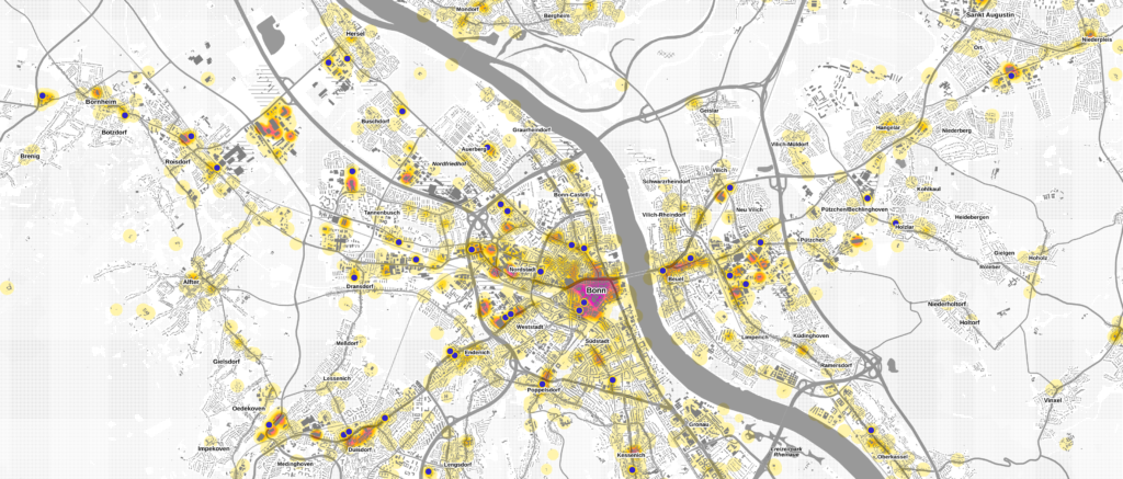 Wie hoch ist die Verkaufsflächendichte in und um Bonn? Wo sind Standorte von Lebensmitteldiscountern? Der WIGeo Standortatlas liefert Antworten auf einen Blick. Bild: WIGeoGIS Gesellschaft für digitale Wirtschaftsgeographie mbH