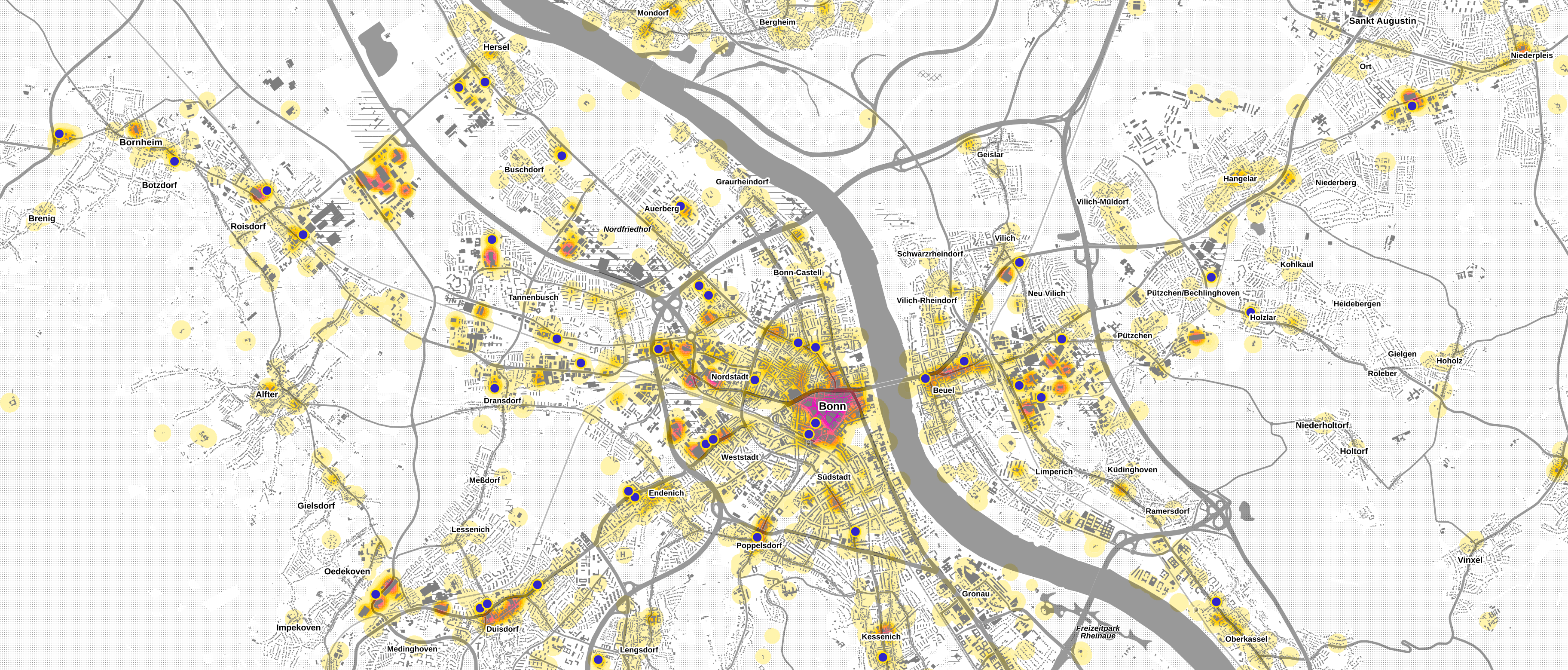 Die Heatmap Trendlagen zeigt schließlich Häufungen von Geschäften mit extravaganten Sortimenten aus den Bereichen Bekleidung, Schuh- und Lederwaren sowie Wohn- und Modeaccessoires sowie Mono Label-Stores. Das Angebot hier richtet sich damit nicht an die breite Masse, sondern an Lifestyle- und trendorientierte Zielgruppen. Meist wird das Handelsangebot in Trendlagen außerdem ergänzt durch „hippe“ Gastronomie und entsprechende Dienstleistungen.