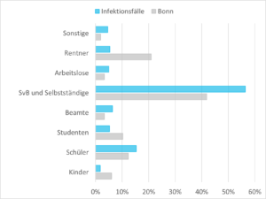 Die Grafik zeigt, wie sich die Corona-Infektionen unter verschiedenen Bevölkerungsgruppen verteilt (blauer Balken): Spitzenreiter sind die Sozialversicherungspflichtig Beschäftigten und Selbstständigen mit etwa 55 Prozent, Schlusslicht die Kinder (unter 6 Jahren) mit lediglich rund 3 Prozent. Der graue Balken stellt zudem den prozentualen Anteil einer Bevölkerungsgruppe an der Gesamtbevölkerung Bonns dar. Grafik: infas 360 GmbH